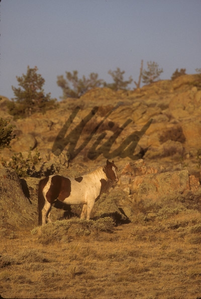 - Paint Wild Horse against moss rock background in Wyoming hills