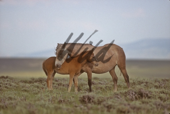 - Wild Horse mare and foal stand together on grassy hilltop