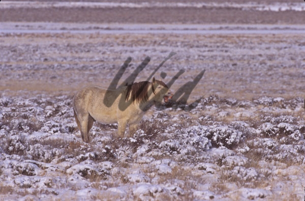 - Wild Horse yawning on snowy Wyoming prairie Provia